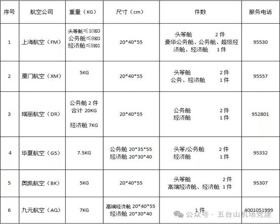 五臺山機(jī)場執(zhí)飛航空公司的隨身手提行李標(biāo)準(zhǔn)
